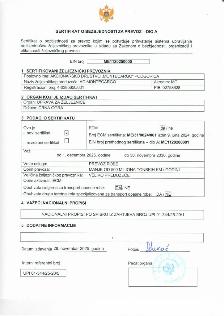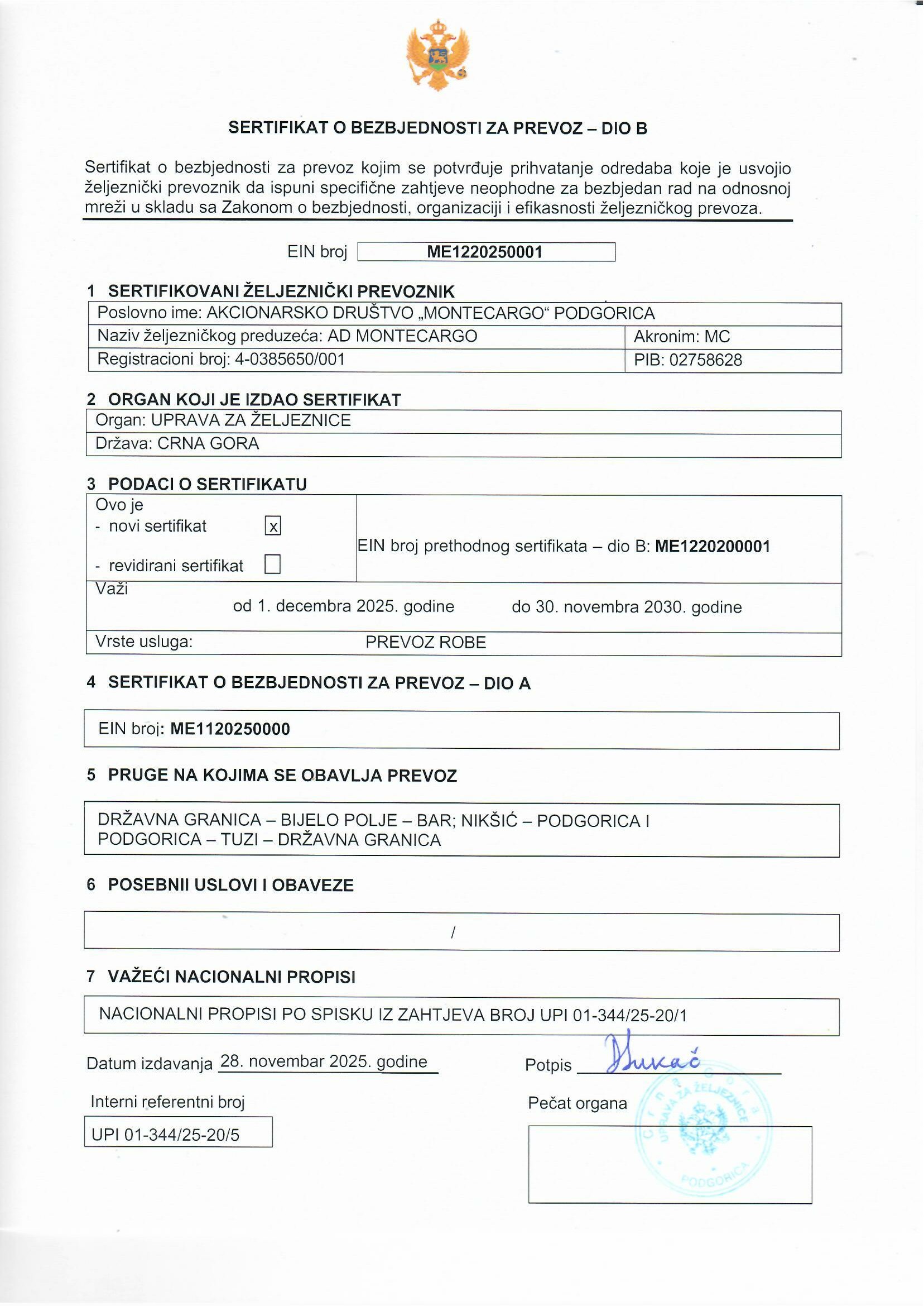 Broj Sertifikata o bezbjednosti za prevoz – dio A (EIN broj) je ME1120250000, broj Sertifikata o bezbjednosti za prevoz – dio B (EIN broj) je ME1220250001), a broj Rješenja: UPI 01-344/25-20/5.