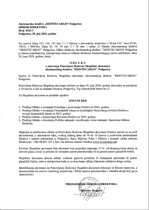 Obavještenje o sazivanju Ponovljene Redovne Skupštine akcionara Akcionarskog društva ”MONTECARGO” Podgorica